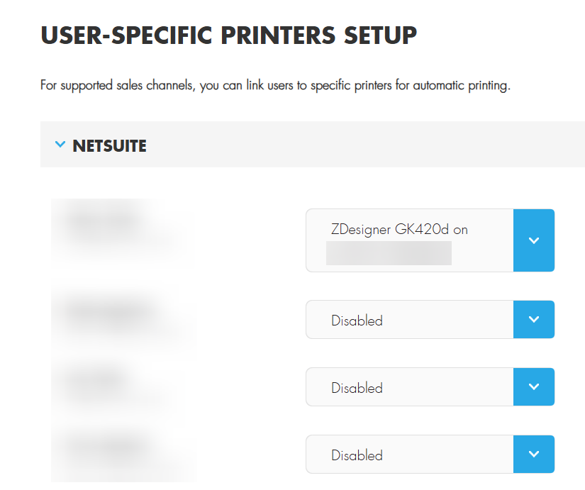 Head to the User-Specific Printers Setup page and, as long as you have your Netsuite users saved in your account, you should see something similar to this: