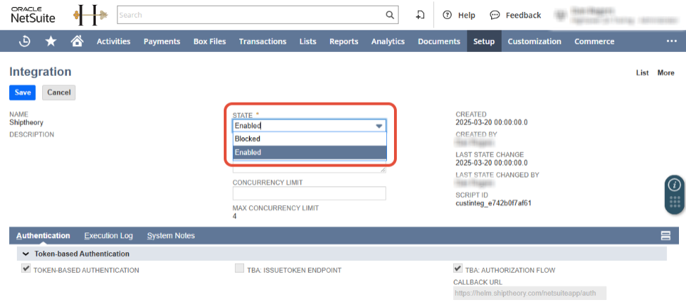 If "Shiptheory" is marked as blocked then edit the integration and change its state from "Blocked" to "Enabled" and save your changes.