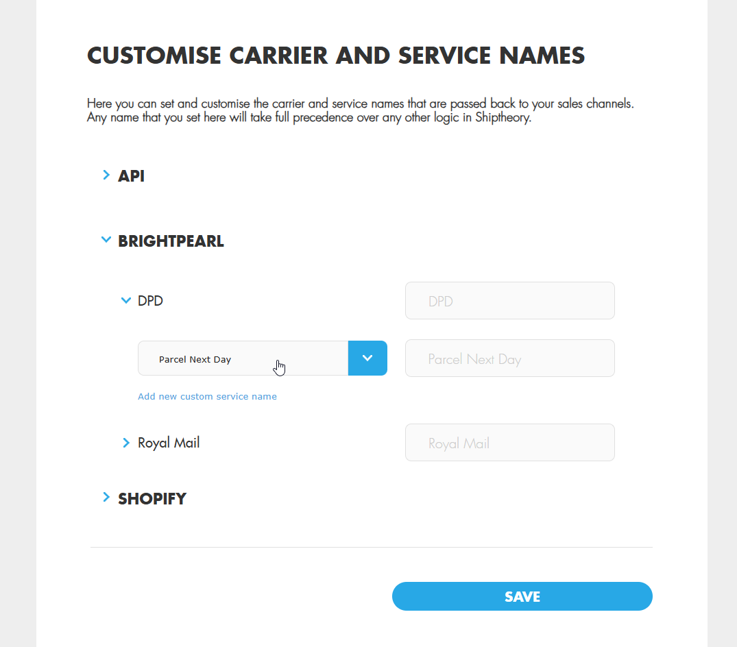 The page will list each of the active sales channels on your account, including the Shiptheory API. Each active carrier is then listed under each sales channel. To change the name of a carrier sent back to a sales channel, simply enter a custom name next to the carrier name.