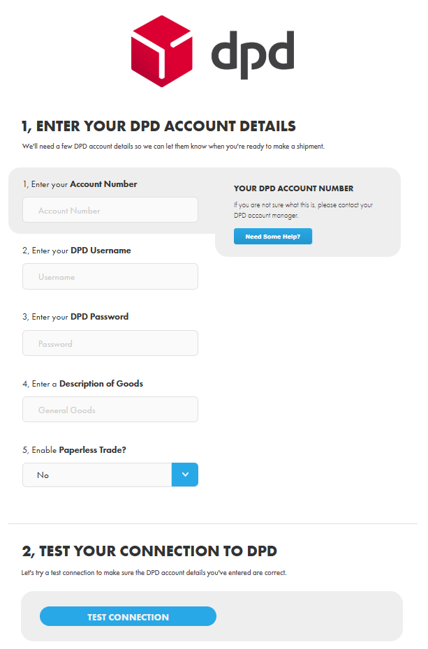 - When inside your chosen courier box, add in the requested details, these are normally your account number/ account name and password. after filing all that out click the test connection and your courier should be readded. (Example below)