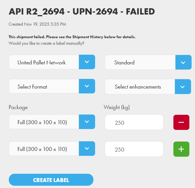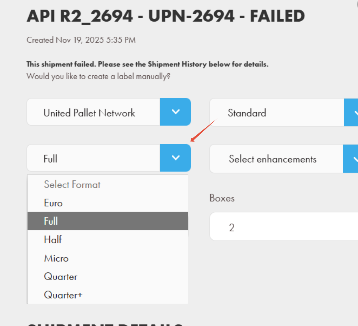 Within Shiptheory, there are two ways to select a pallet with United Pallet Network: by using Shiptheory packages or by using Format.