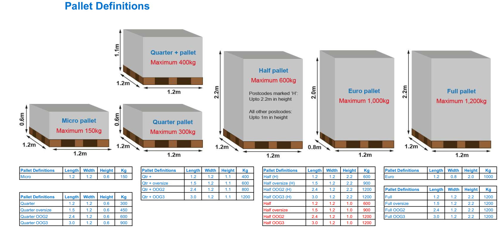 United Pallet Network (UPN) offers a range of pallet size variants, including Oversize, Out of Gauge 2 (OOG2), and Out of Gauge 3 (OOG3), available across different pallet types such as Full, Euro, Half, Quarter, Quarter+, and Micro.