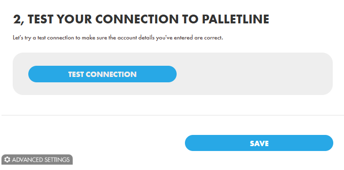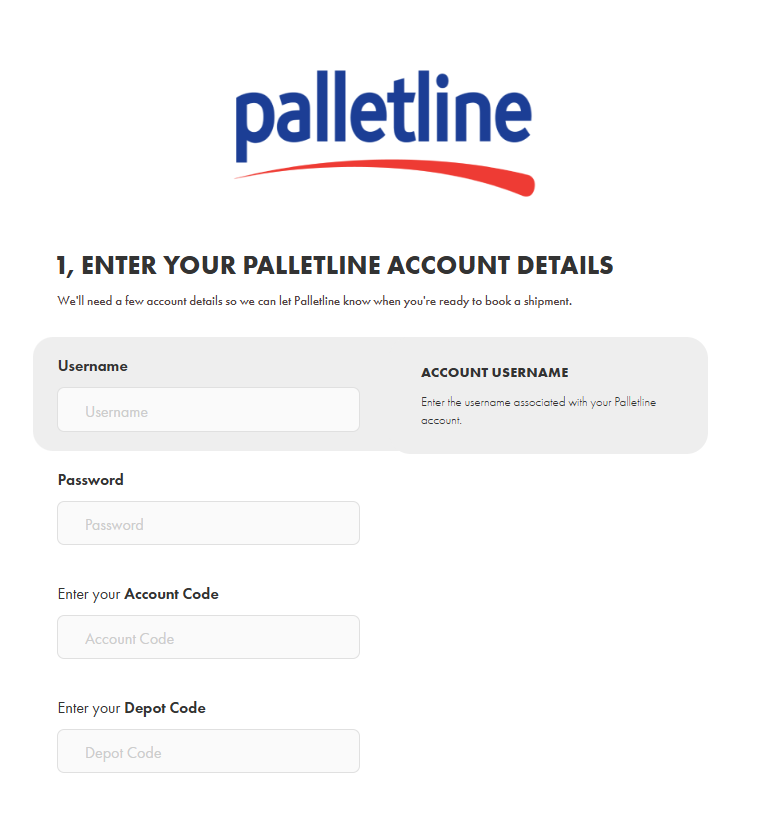 This will redirect you to the Palletline settings page, where you can enter your Palletline username, password, account code, and depot code, all of which you would receive from Palletline.