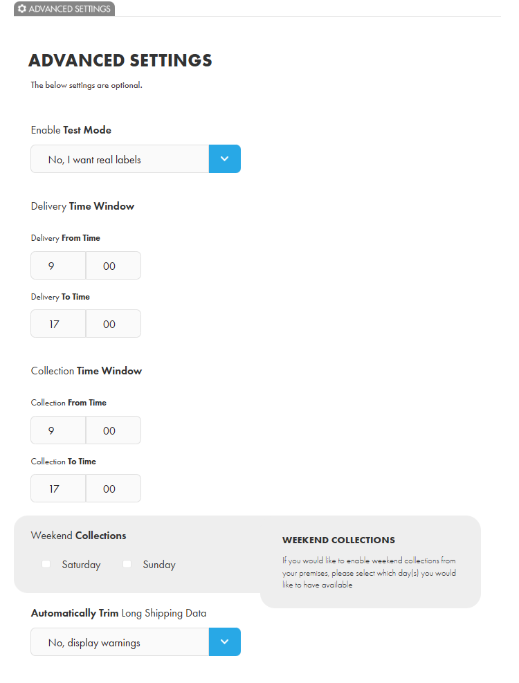 Advanced settings for your Palletline configuration can be found in the Advanced Settings section below. The Delivery Time Window and Collection Time Window fields define the times that Palletline can collect and delivery from and to. You also have the option to enable weekend collections. Adjust these to your preferred settings and make sure to click Save.