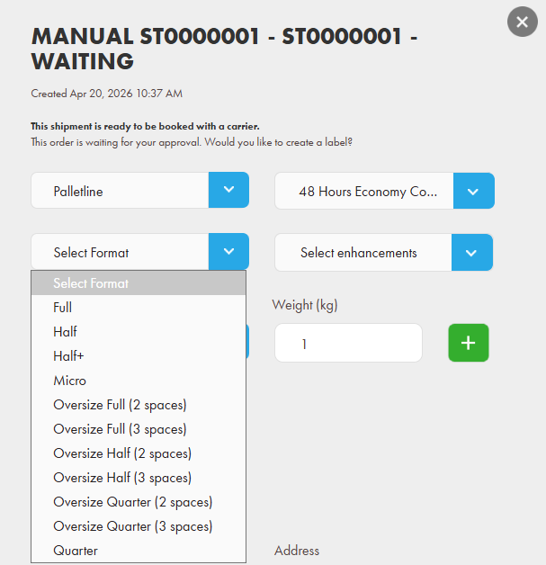 Once you have selected your service, please select a format for your pallet, and then you will have the options to include any enhancements. Enhancements are optional add-ons you can apply to your shipment, however, please be aware that these will be additional surcharges.