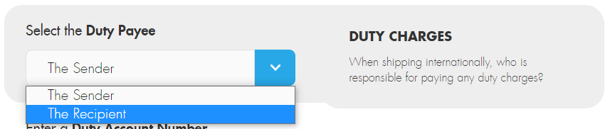 You will also need to set the duty payee to The Recipient at the Select the Duty Payee menu, shown below.
